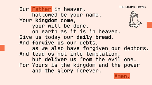 Our Father in heaven, hallowed be Your name. Your kingdom come, your will be done, on earth as it is in heaven. Give us today our daily bread. And forgive us our debts, as we also have forgiven our debtors. And lead us not into temptation, but deliver us from the evil one. For Yours is the kingdom, the power, and the glory forever. Amen. Matthew 6:9-13 (NIV)