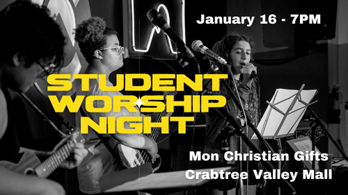 We are hosting a STUDENT WORSHIP NIGHT this Friday, January 16 @ 7PM at Mon Christian Gifts (Crabtree Valley Mall). Make it a fun night with friends! Hang out, grab some food, then come worship with us in the store. This is a meaningful outreach opportunity and time to connect with Jesus.